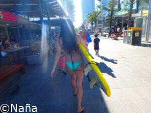- 波の巻き方が強い時は脱げ防止にTシャツやラッシュガードを着用