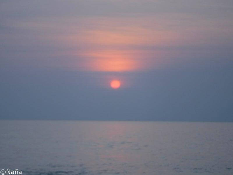 でも、最近は水平線に薄く雲かあって、いつも夕日は途中で消えちゃう。
